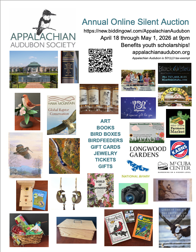 Appalachian Audubon’s Online Silent Auction. Bidding opens on Saturday, April 18 at 6:00 a.m., and runs through Friday, May 1 at 9:00 p.m. The auction will be held on the BiddingOwl website: https://new.biddingowl.com/AppalachianAudubon.